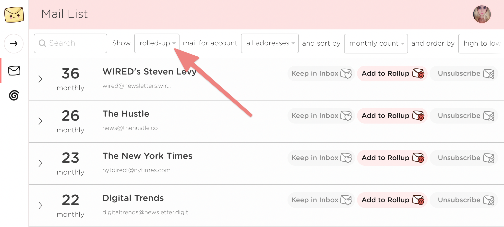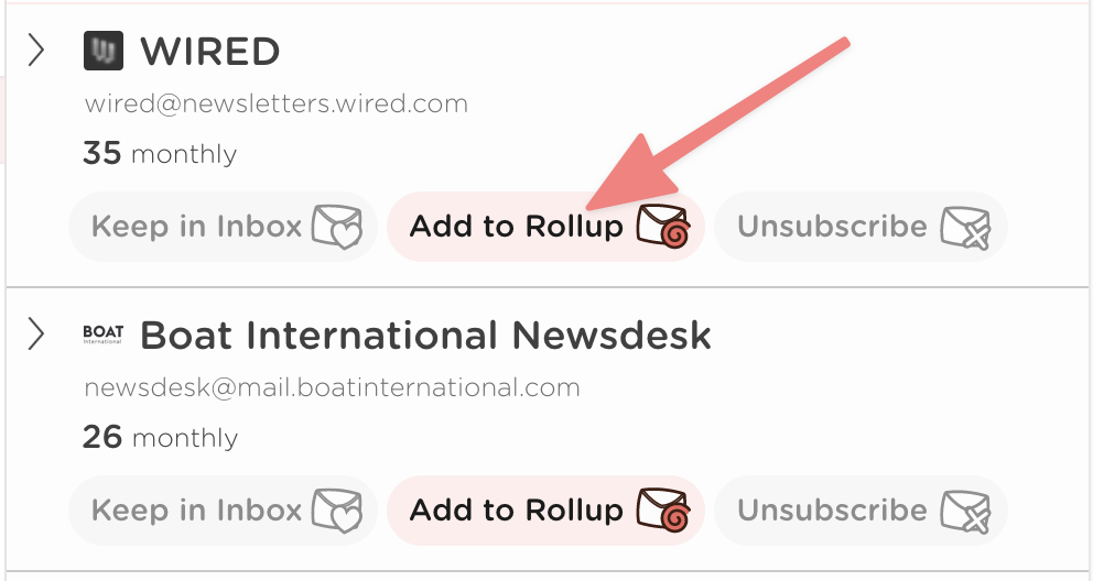 Toggle the "Add to Rollup" button off to remove a sender from your Rollup